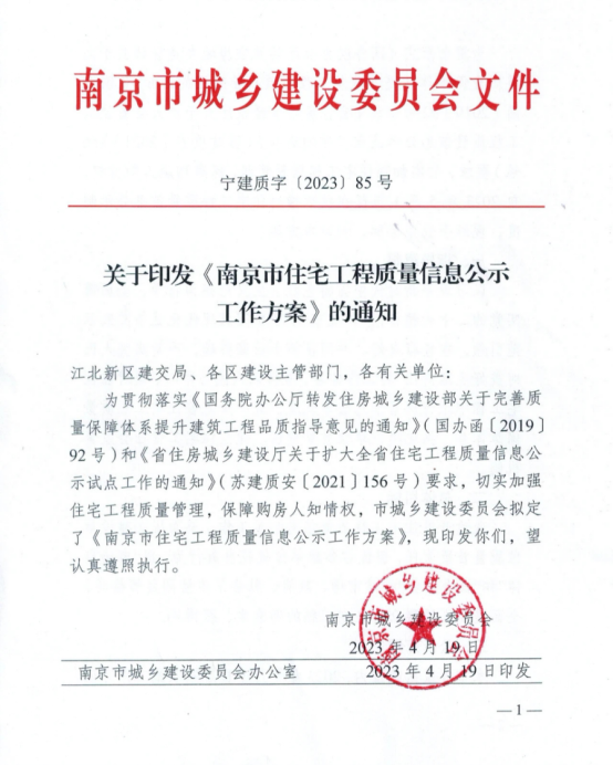 根据南京市城乡建设委员会文件,宁建质字〔2023〕85号文,关于印发《南京市住宅工程质量信息公示工作方案》的通知要求,现将no.2020g87地块(a分区)1#-6#、s1、s2、地下室项目(紫麟景院项目)质量信息进行社会公示,详情如下: